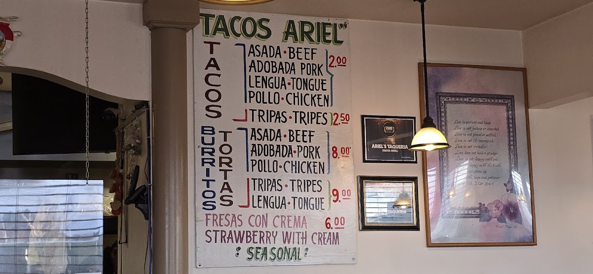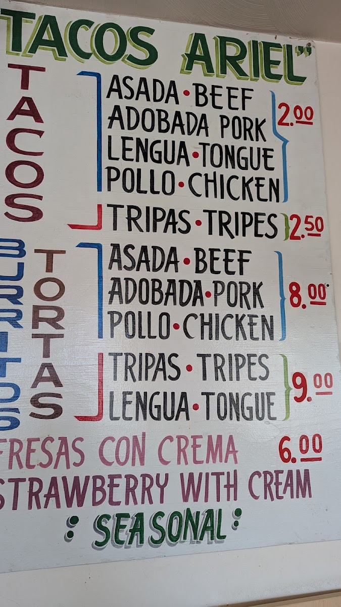 The menu at Ariel's Taqueria offers a straightforward, no-frills selection that captures the essence of a traditional taco spot. You’ll find a range of classic tacos such as Asada beef, Adobada pork, and more adventurous options like lengua and tripas, all prepared fresh and served simply. Alongside tacos, burritos and straightforward desserts like fresas con crema complement the savory lineup.